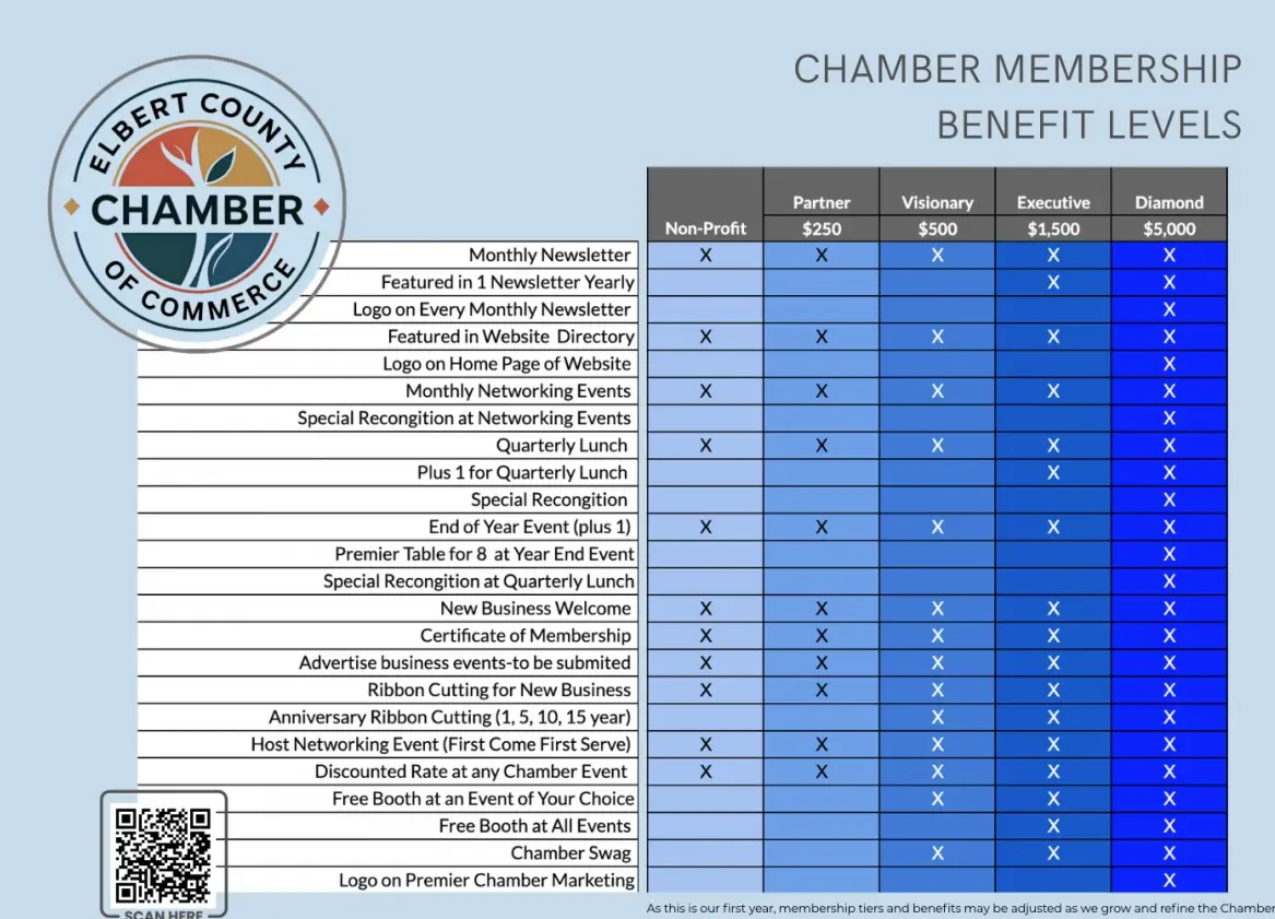 Join the Elbert County Chamber of Commerce to support and strengthen your local business community. We have a variety of membership levels to match your marketing and engagement goals as well as your budget!